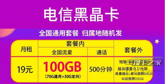 中国电信这款黑晶卡,19元月租的包含100GB全国流量,其中70GB通用流量和30GB定向流量,虽然有30G的定向流量,但是也包含了优酷、腾讯视频、爱奇艺、抖音、快手等等几十款大火大热的APP软件,因此该套餐还是非常值得的。