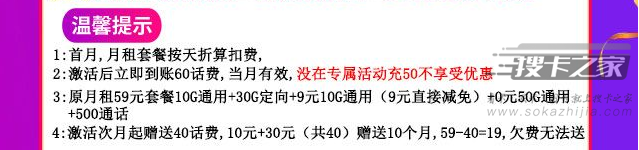 套餐看似便宜,但是也是有充值规则的,需要到卡激活后联系客服在专属链接充值50元可享受“19元月租+70G通用+30G定向+500通话”